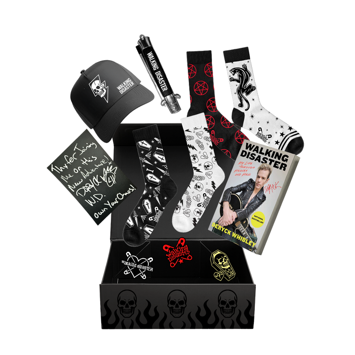 This box is your proof: hand-signed book, handwritten letter, socks that'll never hit the store, exclusive enamel pins, a one off hat, a numbered members card, and more.