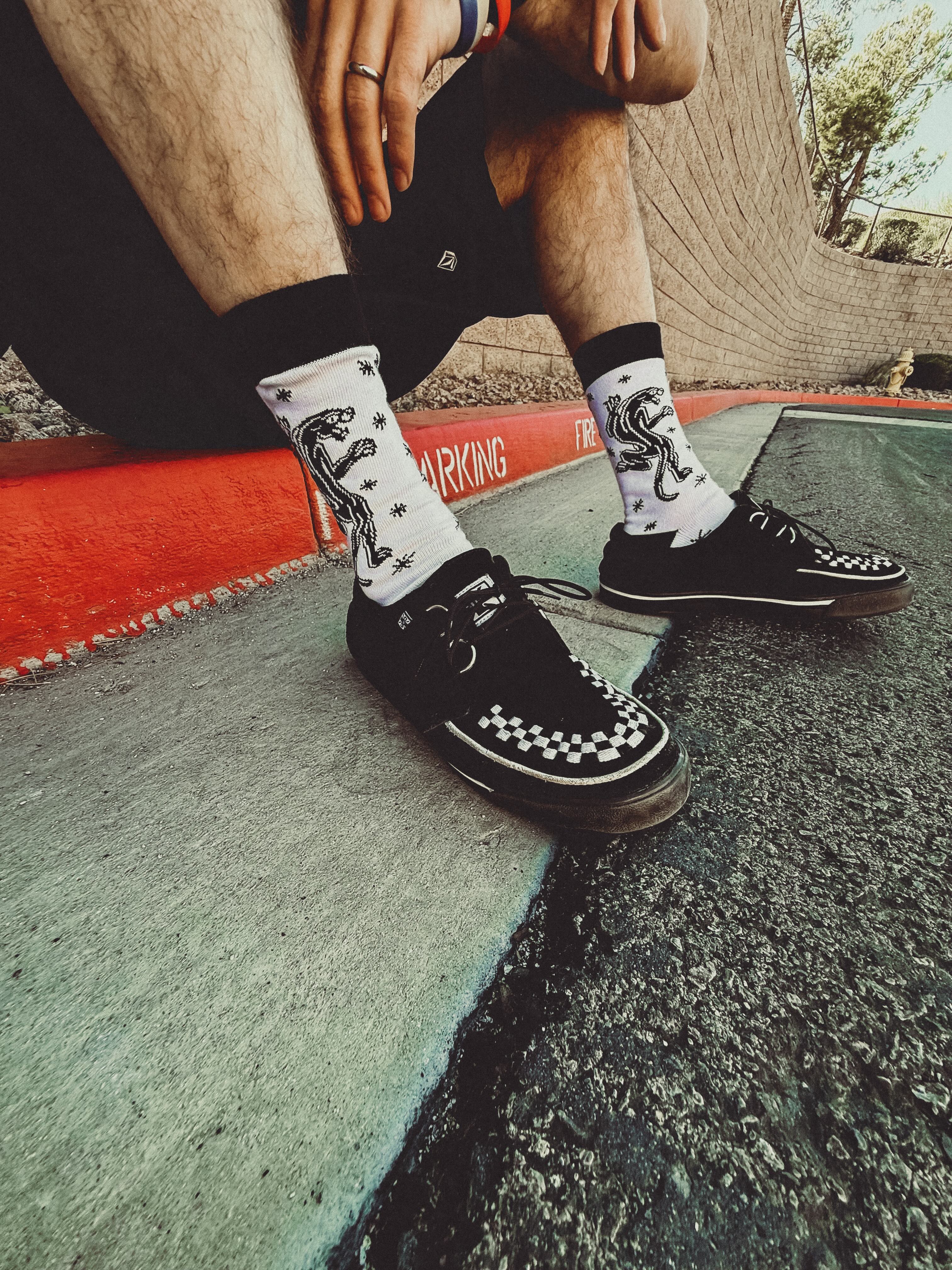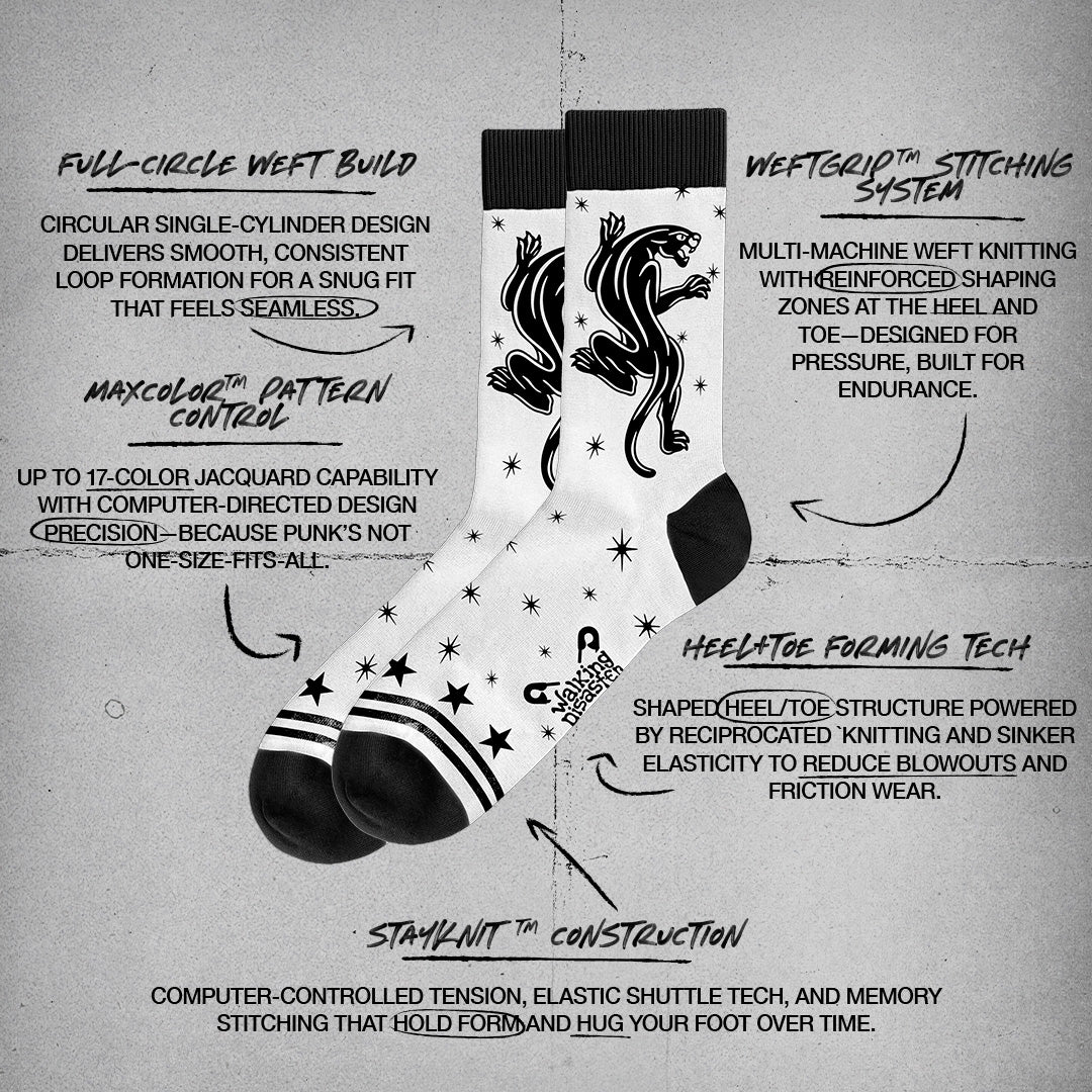 These socks are for those who've used up at least six lives already and are making the remaining three count. For those who know that survival isn't pretty, but it sure as hell is punk rock.